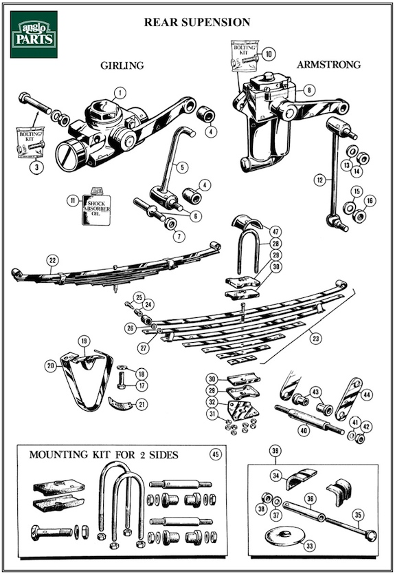 The Editor can also supply new MADE IN ENGLAND shackle pins in EN19T for the TD/TF (and YA/YB/YT) rear (same pin fits the TC front) and black poly bushes, specially made exactly as the original rubber ones (I own the mould); also polyurethane rear spring pads (‘saddles’) and interleaf spring pads made from Nylatron.