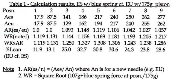 As noted above, if required, a needle profile change can be used together with a piston weight. For example, a EU needle leaner than ES with an average area ratio (AR) of 1.19 can be coupled with a 175g piston weaker than a blue spring giving a weight ratio WR = square root of (239/ 175) = 1.169. Thus the leanness ratio (EU/ES) at position 5 becomes AR x WR = 1.119 x 1.169 = 1.308. The carburettor is then weaker than standard by around 30.8% (see Table 1, below). These are settings I have used successfully on my own TC. An expected fuel consumption with these conditions would be about 1.3 x 28 mpg = 36 mpg on a standard TC.